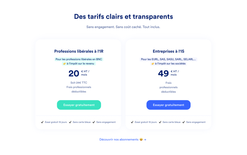 Après le mois offert, l'abonnement passe à 20€ HT/mois si vous êtes en Entreprise Individuelle ou micro-entreprise et 49€ HT/mois si vous êtes en société.
